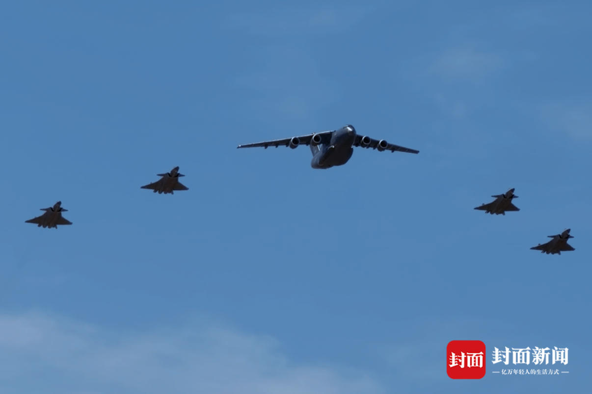 4月22日上午11点13分,空军专机运-20B出现在沈阳桃仙国际机场上空,由空军4架歼–20战斗机伴飞护航。封面新闻记者 戴云 摄