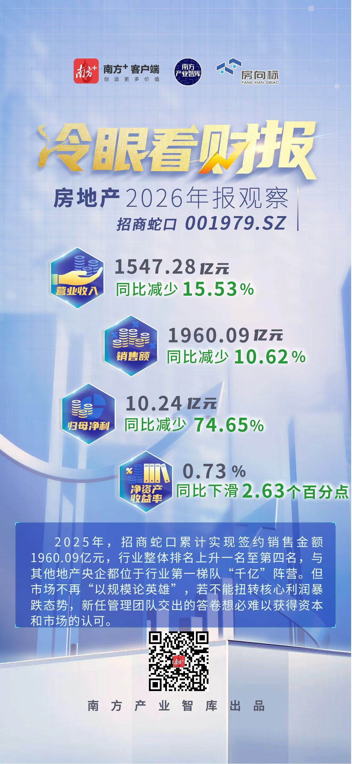 3月17日,招商蛇口(001979.SZ)2025年度业绩说明会暨投资者交流会在深圳全新办公场地举行,新任董事长朱文凯表示,2026年公司将坚守核心城市布局战略,聚焦“好房子”产品升级,摒弃盲目规模扩张,坚定追求有质量、有回款的可持续增长。然而,作为朱文凯接任董事长后向市场交出的第一份年度答卷,成绩并不光鲜。