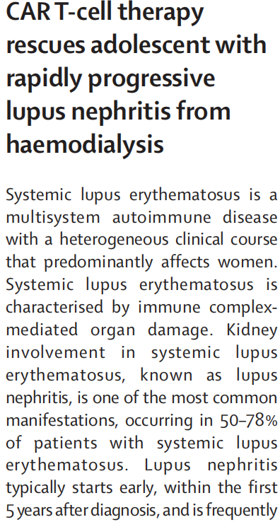 这不是某个不靠谱博眼球的虚假宣传,而是被发表在全球顶级医学期刊《柳叶刀》(The Lancet)上,全世界首例青少年/儿童应用CAR-T细胞疗法治疗系统性红斑狼疮的真实病例。